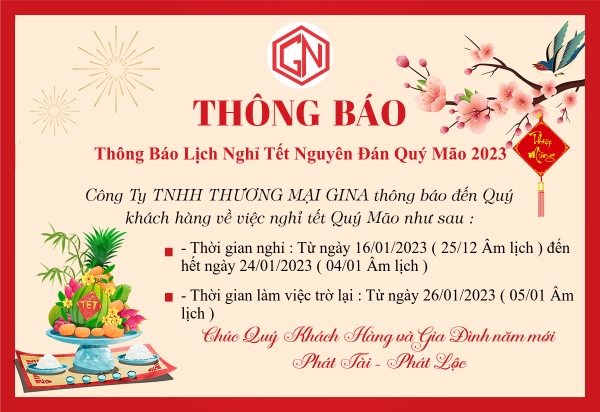 Lời đầu tiên, Công Ty TNHH TM GINA xin chân thành cảm ơn quý khách hàng và đối tác đã đi cùng và ủng hộ Túi Xốp GINA trong suốt năm 2022 vừa qua. Hòa mình với không khí chào đón xuân Quý Mão 2023, GINA xin thông báo lịch nghỉ tết nguyên đán xuân Quý Mão như sau: